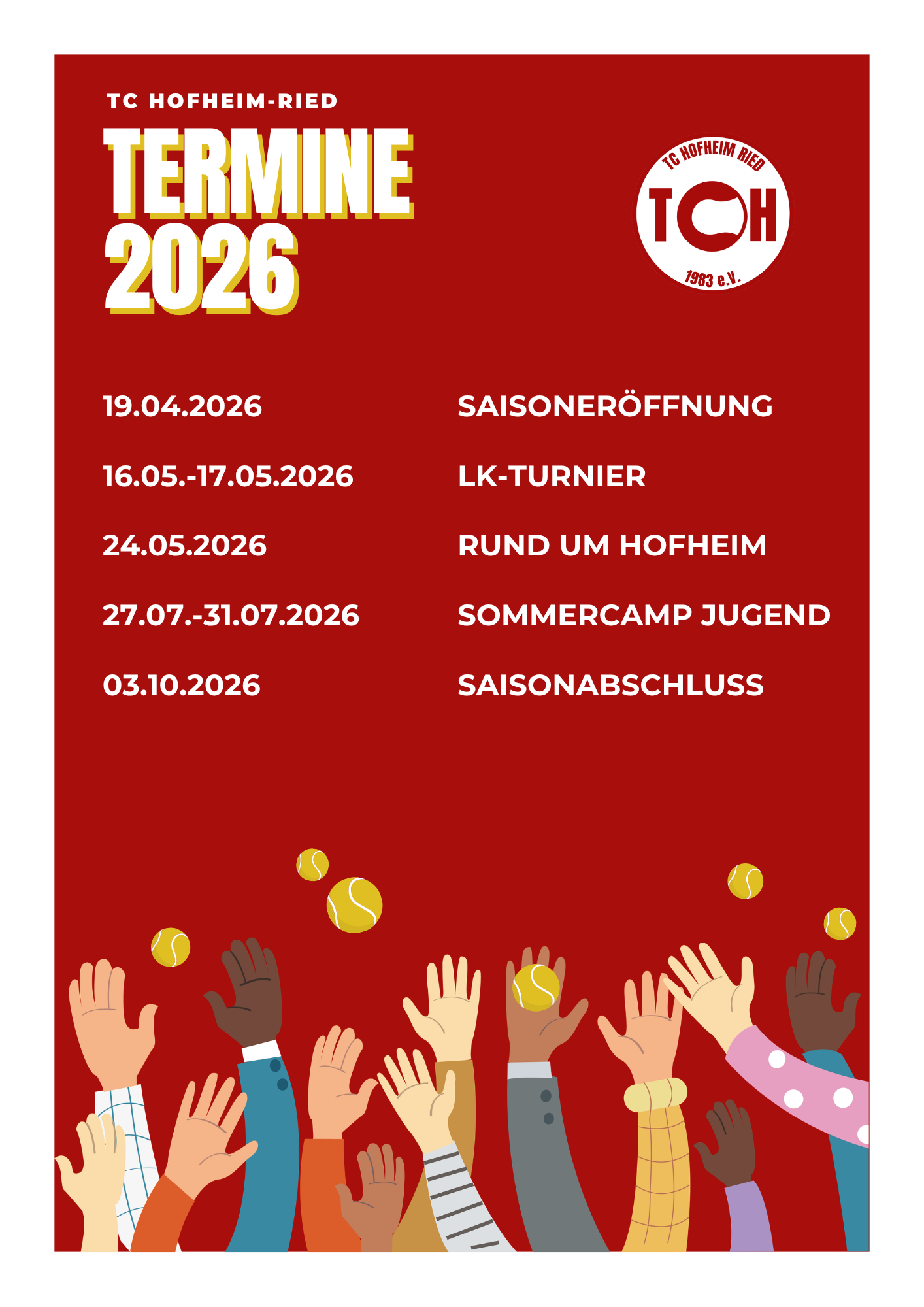 Der TC Hofheim ist einer der jüngsten Vereine Hessens. Im Jahr 2025 starten wir voraussichtlich mit acht Teams in den Altersklassen U8 bis U18. Zum Training begrüßen wir Kinder ab 3 Jahren. Kommt und spielt mit uns.